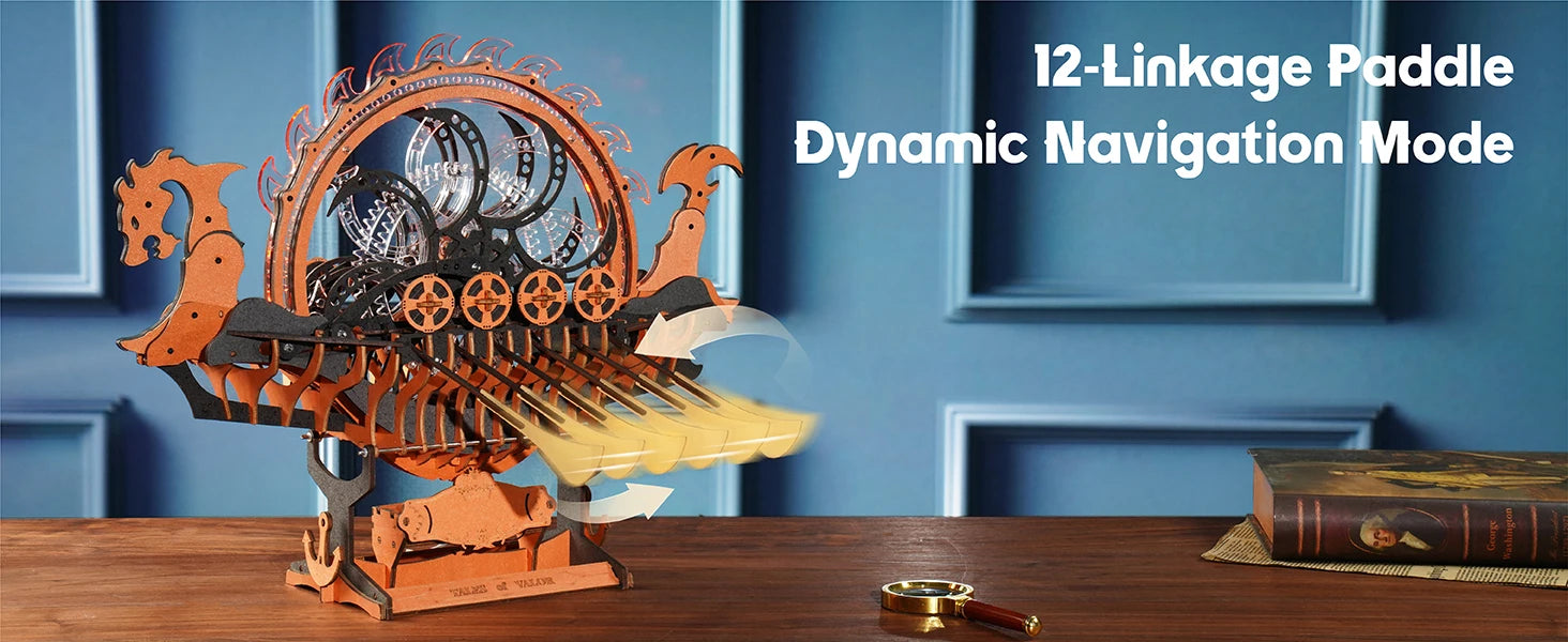 Embark on a voyage back to the Viking era with our captivating Viking Dragon Ship 3D wooden puzzle. Featuring an innovative hidden motor, the blazing flywheel ignites into action, setting the dragon boat's double-sided oars in motion through an ingenious crank and slider mechanism. Witness the spectacle as orange LED lights simulate fiery flames, creating a mesmerizing dynamic effect that pays homage to Iceland's Viking navigation legacy.