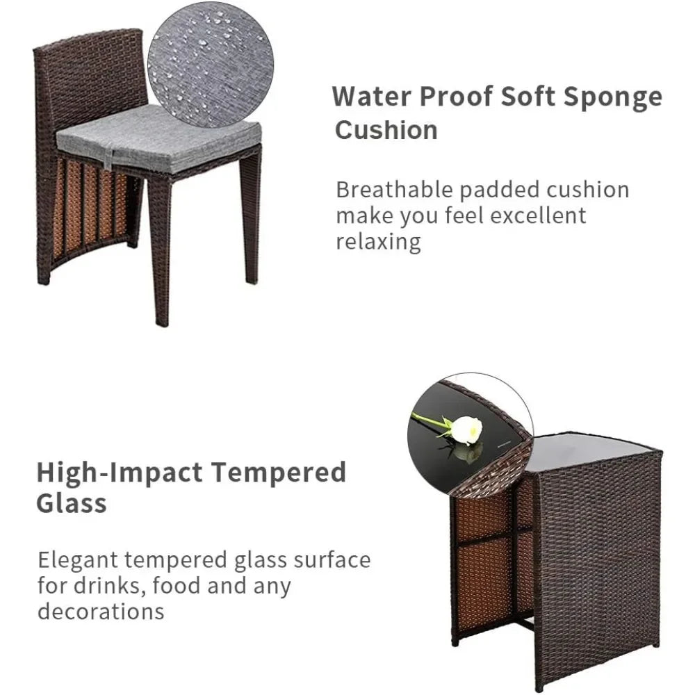 - [Space-saving design] : Enjoy a small patio space with this compact apartment patio furniture, featuring two chairs that can be easily stored within the table when not in use (Two chairs are in different sizes)
