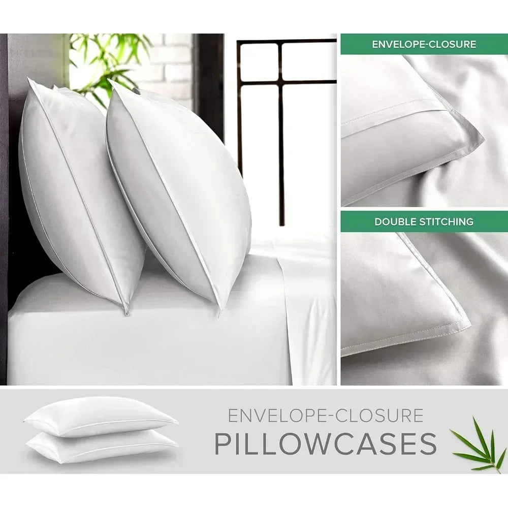 - ✔ COMPLETE 4-PIECE QUEEN (60"x 80") BED SHEET SET - Includes 1 fitted sheet, 1 flat sheet and 2 envelope-style pillowcases with overlapping closure. The pillowcases and flat sheet feature quality sewn double-stitched seams to ensure long-lasting durability and easy care with cold water washing, while offering a sensuous silky feel that grows luxuriously softer with every wash.