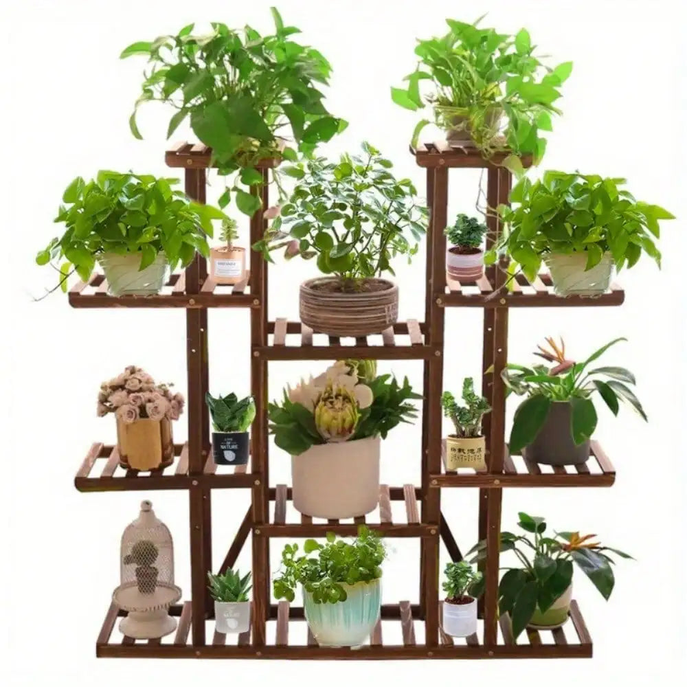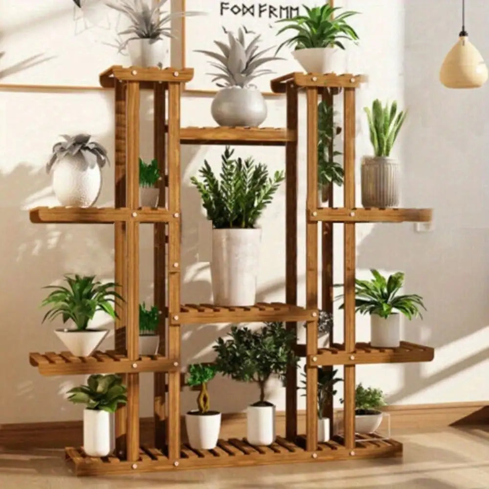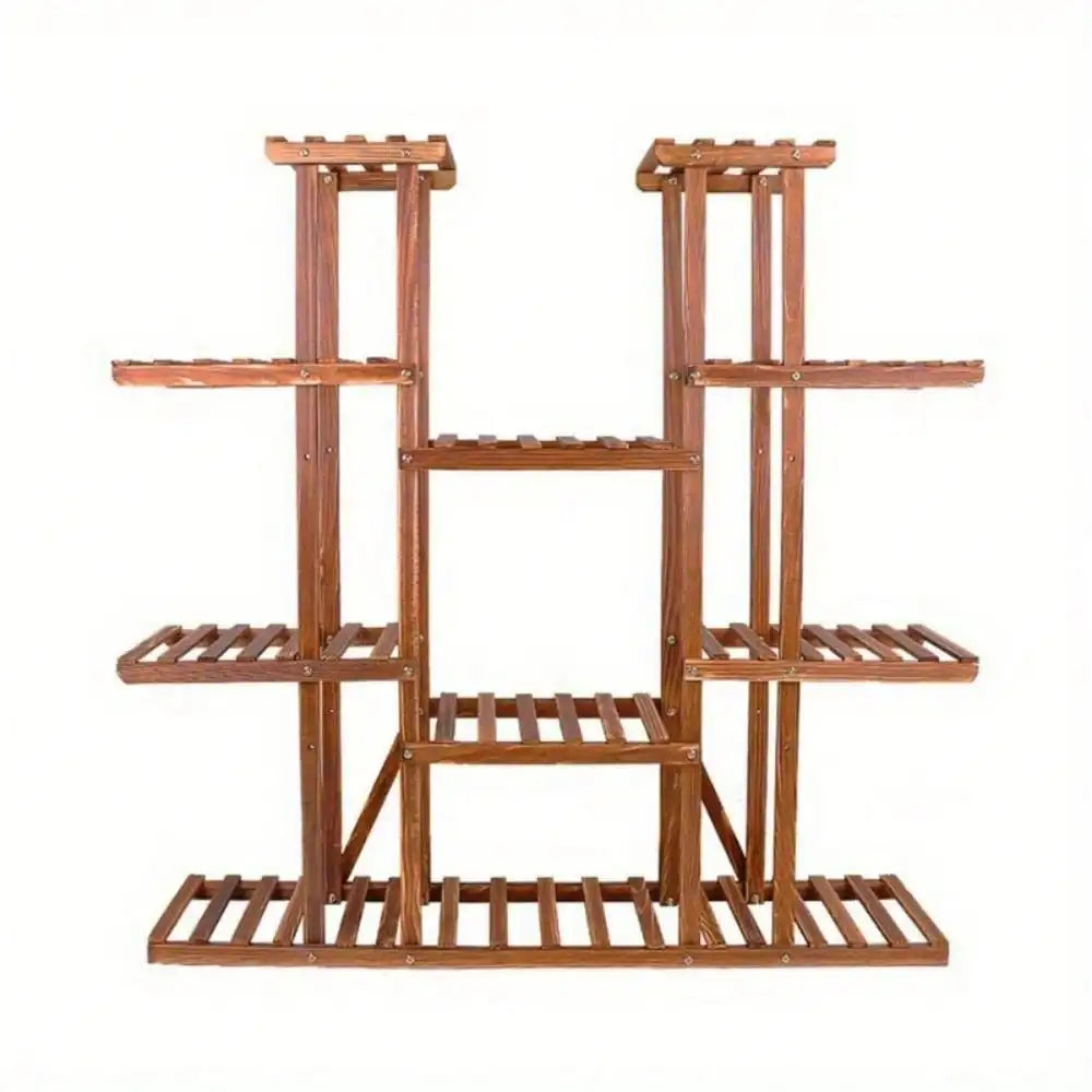 11 Tier Wood Plant Rack Stand Shelf - Planter Flower Pots Shelves Holder Stand Indoor Outdoor for Multiple Plants Display Carbonized Solid Wood 11 tiers offering sufficient spaces for storing and displaying assorted vigorous potted flowers. In addition, it can be used for exhibiting pictures, paintings, knickknacks, other artworks.