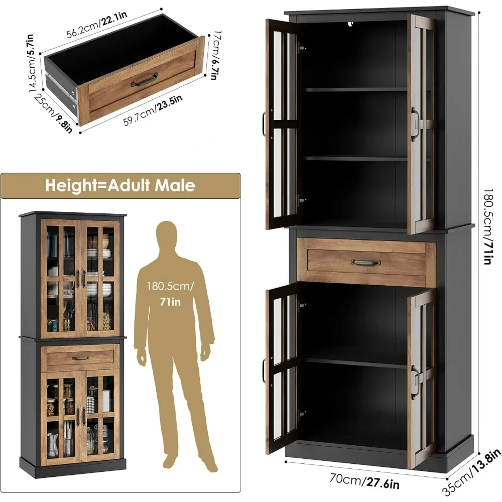 Kitchen Cabinet, Tall Cabinet with Glass Doors and Drawer, Freestanding Pantry Hunch with Adjustable Shelves, Cabinets Kitchen