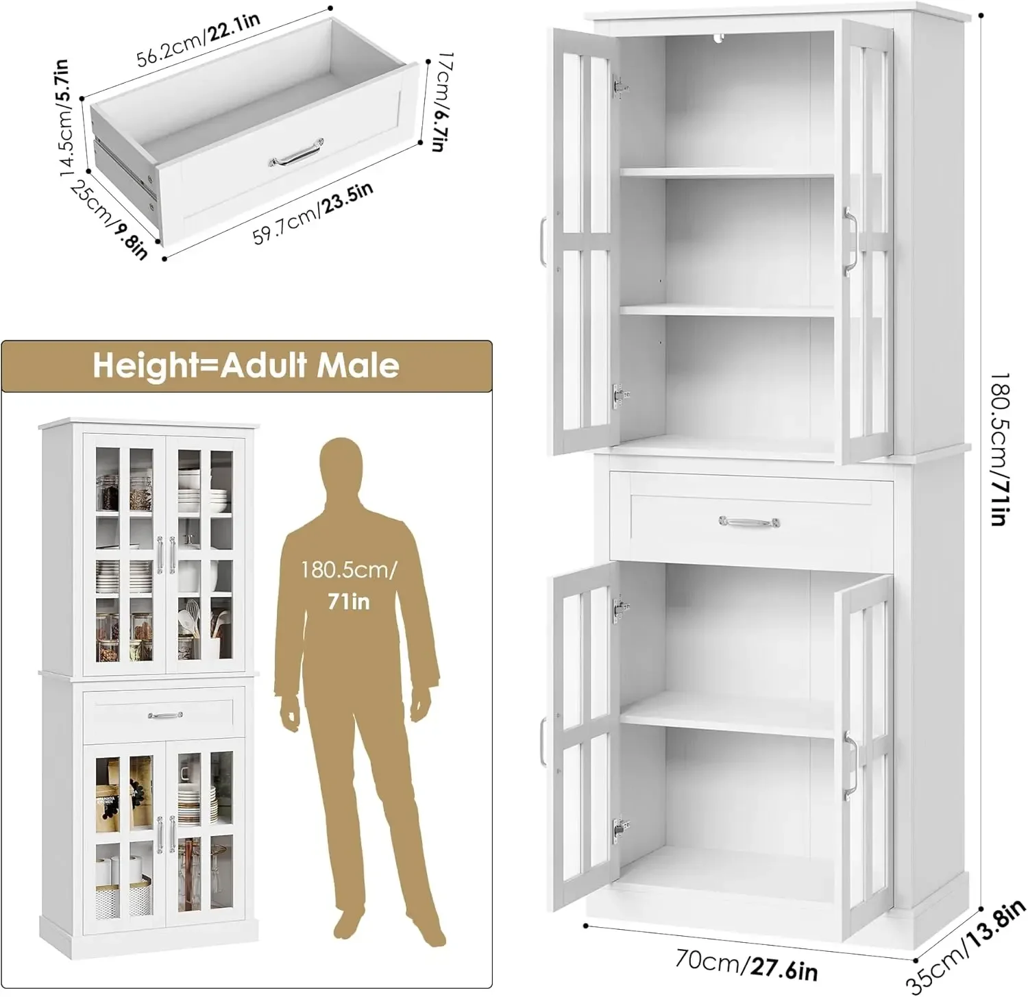 - 【Pantry Cabinet with Amazing Storage】With 5 storage cabinets and a deep drawer, this pantry storage cabinet provides plenty of storage space to keep your household items organized. The glass display cabinet allows you to see the kitchen appliances inside more clearly. Your home can look fabulous without compromising on the ever-important storage. This white pantry cabinet can be used in the kitchen, living room, dining room, entryway, and other corners, or as a file cabinet, display cabinet, or bookcase in your home office.
