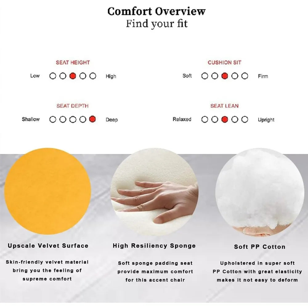 - Selected Material and Easy to Maintain: Made of upscale tufted upholstered velvet, this chair is comfortable to sit on and soft to the touch. It will not wrinkle and fade after long time use. Easily clean spills with a damp cloth. You can read a book or magazine or take a nap on it at your leisure time