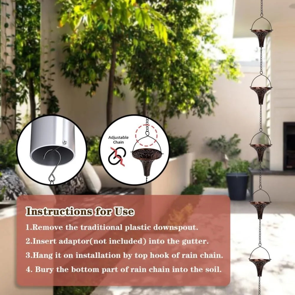 Easy to Use: The rain catcher chain is easy to install, hang the hook on the adapter and you can use it. Decorating the eaves instantly makes your house elegant. When it rains, listening to the rain chain brings you a unique and pleasant sound, making people feel amazed.