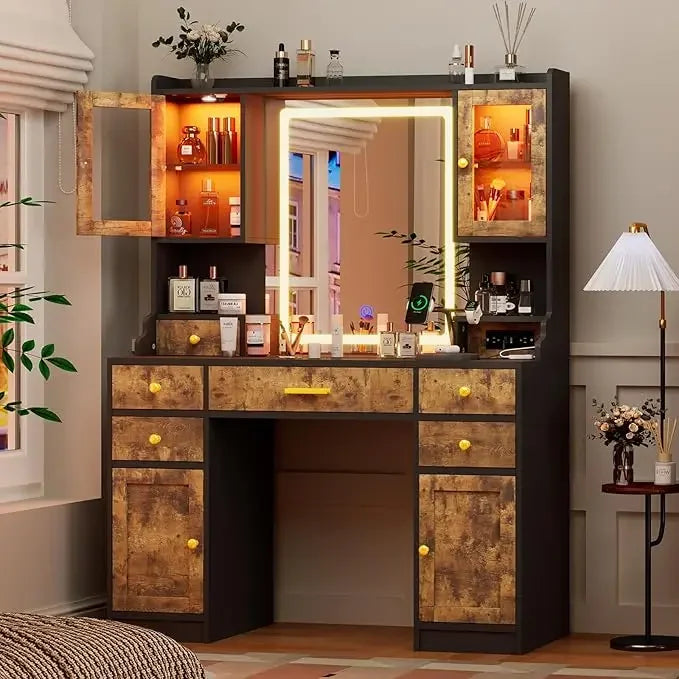 - 【Vanity Desk with RGB Cabinets】This vanity is equipped with 2 cabinets with height-adjustable laminates and an RGB lighting system, which can be controlled via APP or a switch. With over 60,000 static colors available and multiple lighting modes, the system can synchronize to music for a stunning visual experience while you relax or entertain.