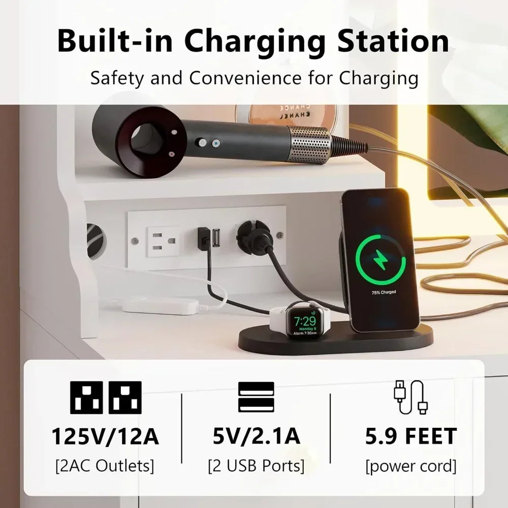- 【Vanity Desk with Charging Station】This modern vanity desk comes with a power strip that includes 2 standard plug sockets and 2 USB ports, allowing you to sit at your vanity and use your hair dryer or curling iron within easy reach and charge your phone, tablet, or other electronics.